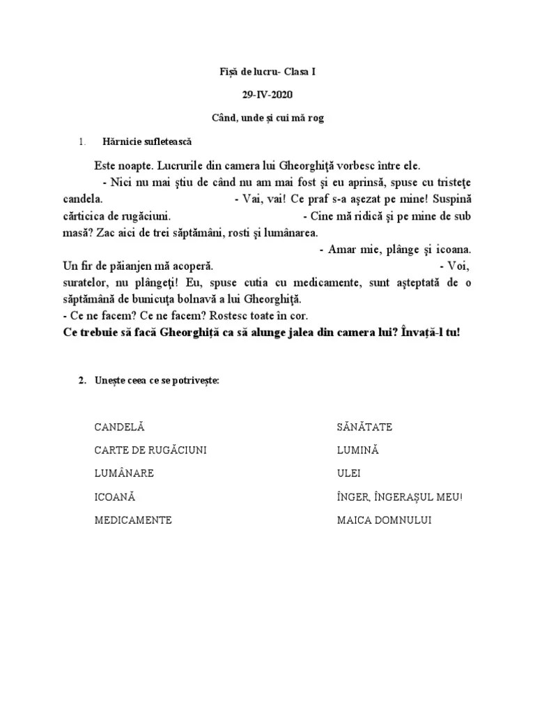 Cu cine mă rog în biserică;. Omul ascultă cuvântul lui dumnezeu; Sunt creștin și la școală; Copiii vor trebui să coloreze elementele create de dumnezeu, să unească punctele și să rezolve labirintul. 23.10.2018 · fișă de recapitulare pentru prima unitate de învățare la clasa pregătitoare.